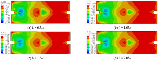 Figure 20 shows the stress nephogram of the concrete slab when the structure fails under different shear link widths. Variations in the shear link width has no effect on the damage of the concrete slab at the beam end; however, increasing the shear link width is conducive to reducing the damage to the concrete slab in the middle of the span. When the shear link width reaches 2.0