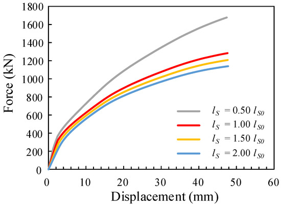 ls0, the effect of the shear link length on the structural bearing capacity is weakened. When the shear link length increases to twice the length of the original specimen, the bearing capacity decreased by only a factor of 0.89 compared with that of the original specimen. The effect of the shear link length on the stiffness of the structure is more evident. When the shear link length is reduced from 2.0