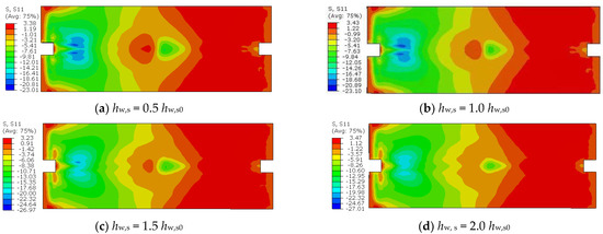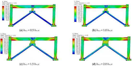 Figure 19 shows the stress nephogram of the steel frame when the structure fails under different shear link web widths. The shear link web width has no discernible effect on the stress distribution at the beam end and column bottom end. Variations in the shear link web width mainly affect the stress state of the mid-span steel beam. The larger the shear link web width, the higher the stress on the lower edge plate of the mid-span steel beam. When the shear link width exceeds 1.0