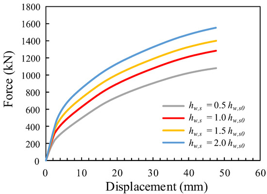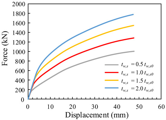 Figure 24 shows the load–displacement curves of the structure for different shear link web thicknesses. The development trend of each curve is essentially identical.