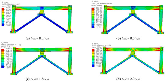 tw,s0, the frame structure yields at the beam end and column bottom end, and at the lower edge of the mid-span steel beam. In addition, an increase in the shear link web thickness leads to a slight increase in the stress of the diagonal brace. When the shear link web thickness increases to 2.0