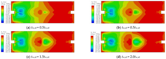 Figure 22 shows the stress nephogram of the steel frame when the structure fails under different shear link web thicknesses. The shear link web thickness has no discernible effect on the stress distribution at the beam end and column bottom end. Variations in the shear link web thickness mainly affect the stress state of the mid-span steel beam. The larger the shear link web thickness, the higher the stress level at the lower edge of the mid-span steel beam. When the shear link web thickness exceeds 1.0