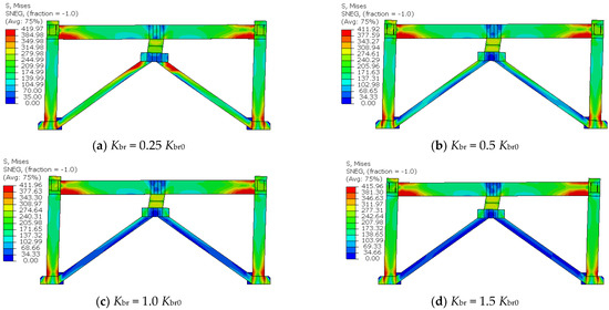 Figure 25 shows the stress nephogram of the steel frame when the structure fails under different diagonal brace stiffnesses. When the diagonal brace stiffness is small, the structure yields at the beam end and column bottom because of the small stiffness of the diagonal brace itself. This indicates that the diagonal brace cannot provide sufficient stable boundary conditions for the shear link for yield energy consumption. The stress level at the end of the frame beam increases gradually with an increase in the diagonal brace stiffness, and the yield range at the end of the frame beam increases significantly when the structure fails. The upper edge of the frame beam also yields significantly, but the stress state of the frame column does not change significantly, and some areas at the bottom of the frame column enter the yield state when the structure fails. In addition, an increase in the diagonal brace stiffness effectively improves its stress state, prevents it from yielding before structural failure, and effectively ensures the expected working mechanism of the vertical shear link.