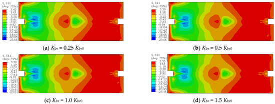 Figure 26 shows the stress nephogram of the concrete slab when the structure fails under different brace stiffnesses. Variations in the diagonal brace stiffness have no discernible effect on the range and degree of cracking of the concrete slab.