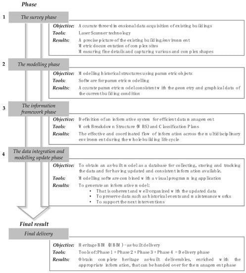 Based on the literature and previous research, this work has identified four stages and related tools to structure a framework to optimize the data flow and to reduce information gaps among the phases. This section introduces a methodological framework developed for managing interventions on heritage buildings and, in detail, for providing appropriate deliverables, the baseline for setting efficient management to reduce costs related to information loss.
