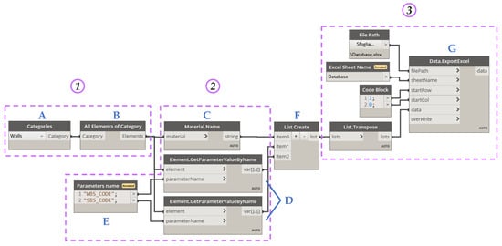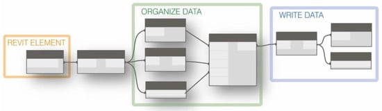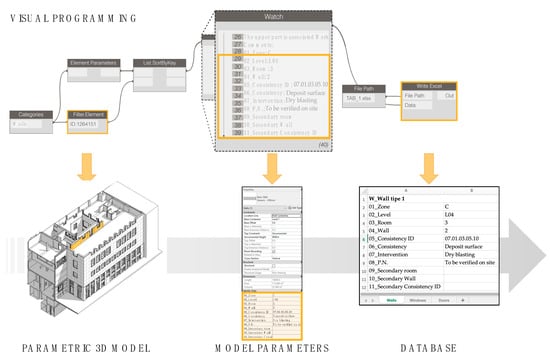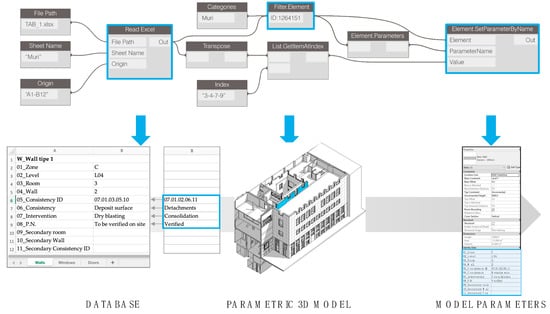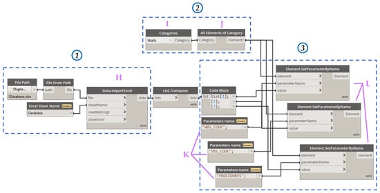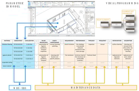For example, due to the integration of information management systems, Dynamo can identify the model categories (walls, floors, doors, windows, etc.) and then select the individual model instances according to the WBS codification. After the first identification, through this process, it is possible to work on data, to update information or to import/export information, filling the model with the required attributes according to the structure that is represented in Figure 5 below and that was implemented in the case study section.