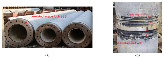To suit various engineering demands, PPCPs utilized in real applications typically have external diameters of 400 mm, 500 mm, and 600 mm. In accordance with the dimensions of PPCPs using HSSS, six full-scale pile specimens with external diameters of 400 mm(P4A/P4B), 500 mm(P5A/P5B), and 600 mm(P6A/P6B) were fabricated for the experimental study. Furthermore, two specimens with diameters of 500 mm but different reinforcement and splice dimensions (P5C/P5D) were tested to validate the Combination Splice design method. Examples of a cross-section of the proposed pile are provided in Figure 5. In order to produce the proposed specimens, (1) two 4-m-long pile segments were molded from high-strength concrete using a centrifugal force. Then, (2) two semi clamp rings were installed into the groove of the splice plates. (3) Finally, full-penetration butt welding was used in situ. More detailed dimensions of the proposed piles and Combination Splices are provided in Table 3 and Table 4.