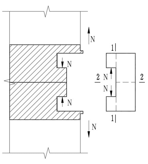 where is the shear stress of section 1-1, is the axial tension, is the diameter of the groove of the U-shaped connecting clamp, represents the thickness of the U-shaped connecting clamp embedded in the end plate, and is the design value of the shear strength of the U-shaped connecting clamp material.
