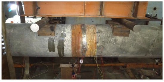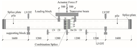 Each specimen was tested using a four-point bending setup under a monotonically increasing load until failure, as shown in Figure 6 and Figure 7. Five linear variable-differential transducers (LVDTs) were used to measure displacement. They were placed in the mid span (2400 mm away from supports) to measure specimen displacements, as well as the 1/4 span (1200 mm away from supports) and supports on both sides. All strain gauges were mounted on specimens outside surfaces since it was challenging to connect strain gauges to steel strands. Five electrical resistance strain gauges (1#~5#) were mounted on the clamp ring’s surface, and another nine electrical resistance strain gauges were installed on the pile’s surface. In detail, 6#~10# strain gauges were evenly distributed along the depth of the mid span section and on the concrete surface next to the Combination Splice. Strain gauges 11#~14# were equally placed along the bottom tensile edge near the mid span (±1200 mm). The piles’ cracking behaviors were observed visually.