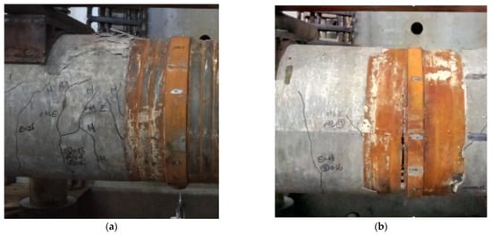 According to experimental phenomena, the most common failure model for PPCPs utilizing HSSS specimens is the crushing of the concrete in the compression area (Figure 8a), followed by the pulling off of the steel strands from the splice plates, while the Combination Splice is left intact. The steel strand pile specimen with the Combination Splice has equally and densely distributed cracks throughout the pile body, which successfully ensures the co-working capacity between two pile segments. There is no evident stress concentration or plastic deformation between the clamp ring and the splice plates, according to a thorough inspection of the Combination Splice. The Combination Splice is still in fine shape, demonstrating the reliability of this splice type’s “equal strength connection”. Another significant finding in specimen P4A, however, is that the anchorage failure (Figure 8b) happens just before the majority of the concrete in the compression zone collapses. To prevent early anchorage failure, more care should be taken, and measurements should be made.