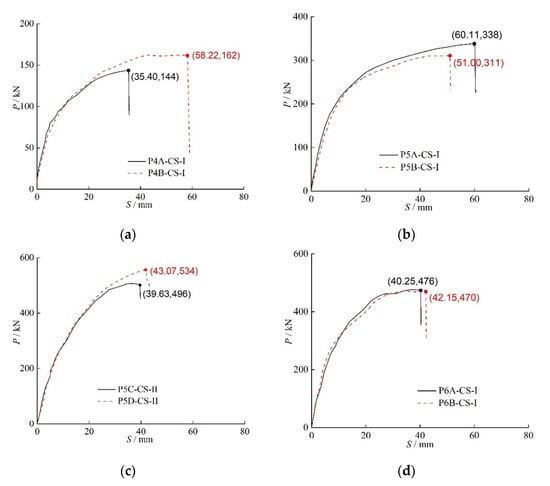 Relationship between the load and the midspan displacement: (a) P4A-CS-I/P4B-CS-I, (b) P5A-CS-I/P5B-CS-I, (c) P5C-CS-II/P5D-CS-II, (d) P6A-CS-I/P6B-CS-I.