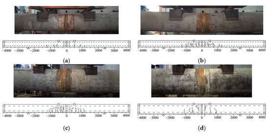Crack distribution of Specimens: (a) P4*-CS-I, (b) P5*-CS5-I, (c) P5*-CS5-III, (d) P6*-CS6-I.