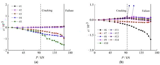 On the graphs, two vertical straight lines were drawn: the continuous line represents the peak load at which specimens fail, and the dashed line represents the observed visible cracking load. The clamp strain and concrete strain have a linear relationship with increasing loads before cracks appear. Some concrete strain gauges show a significant increase in value when the load reaches the cracking load, indicating that the cracks have destroyed the gauges at that location. The concrete strain in the compression zone manifests a clear nonlinear development before reaching the failure load. Accordingly, when the member reaches the ultimate load, the clamp strain alters linearly. One interesting difference is that the outside surface of the clamp ring experiences compressive strain in the specimen’s tension zone, but the outer surface of the clamp ring experiences minor tension strain or nearly no strain in the specimen’s compression region. The theoretical analysis states that the clamp is regulated by bending compressive stress on the outer surface and is under the joint action of a bending moment and tension when it is in tension. However, because of the impact of the assembly gap and the Combination Splice’s machining accuracy, the contact position of the clamp and splice plates becomes more complicated. In general, the clamp ring does not directly participate in the transmission of compression force due to close contact between two splice plates and the assembly gap between the clamp and splice plate; therefore, the surface strain of the clamp should be essentially zero. The clamp ring may assist in bearing the pressure and be subject to the combined action of the bending moment and pressure when the assembly gap is small, the splice plate cannot be in close contact, or local deformation in splice plates occurs. The clamp surface is governed by bending tensile stress because the load direction for compression is directly opposite that for tension. The analysis mentioned above demonstrates how intricately complicated the contact state and stress distribution of the Combination Splice are.