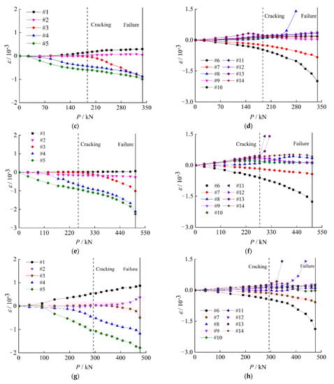 Strain development of specimens: (a) Clamp strain of P4B-CS-I, (b) Concrete strain of P4B-CS-I, (c) Clamp strain of P5A-CS-I, (d) Concrete strain of P5A-CS-I, (e) Clamp strain of P5C-CS-I, (f) Concrete strain of P5C-CS-I, (g) Clamp strain of P6A-CS-I, (h) Concrete strain of P6A-CS-I.