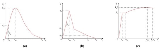 Constitutive law of material: (a) uniaxial compression of concrete, (b) uniaxial tension, (c) uniaxial tension for rebar.