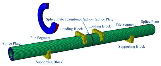 Figure 13 depicts the finite element model’s schematic diagram. The exact dimensions of the piles, splice plates, and clamp rings in the FEA remain consistent with the geometry of the actual specimen. To make the model more straightforward, the clamp ring is modeled as a complete connecting ring, and the steel annular plate and welding seam in the Combination Splice are ignored. Two elastic loading blocks and two elastic supporting blocks are constructed to prevent abnormal stress concentration at the loading and supporting locations.