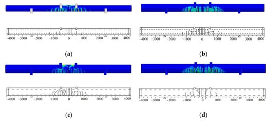 The bending response of the test piles with the Combination Splice is examined using the material characteristics, interaction settings, and finite element model. The comparison of four distinct pile types’ experimental data and results from numerical simulations on the load–displacement curve is shown in Figure 14. As can be seen, the ultimate load and displacement derived from the simulation are consistent with the experimental values, and the development trend of the simulation curve is essentially consistent with the experimental curve. The numerical simulation curve’s slope, however, is greater than the experimental curve at the time before cracking. One reason could be that there are some gaps in the specimens’ real assembly when using the Combination Splice. With an increase in force, the gaps began to close during the experiment, reducing the stiffness of the test specimens. The bending stiffness of the simulated curve rapidly drops from the point of specimen failure through cracking, which is in good agreement with the test curve.