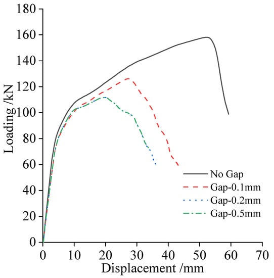 As mentioned in Section 4.4, the contact state and stress distribution of the Combination Splice are rather complex. In fact, the contact state between the clamp ring and the end plate is exceptionally complicated by the machining accuracy and the roughness of the contact surface. Moreover, the local separation, local contact, or contact surface expansion occur with the load change, making it impractical to study the detailed stress state. In engineering practice, the zero gap between different parts of the Combination Splice is almost impossible. To study the effect of the assembly gap, three different gap distances are simulated using a verified FEA model. The gap distance is shown in Figure 16, and the load–displacement curves of three gaps of Combination Splices are plotted in Figure 17. It can be seen that the distance of the assembly gap has a large impact on the load carrying capacity and ductility of the members using the Combination Splice. Unlike the zero-gap model, in the models with larger gaps (0.2 mm and 0.5 mm), some of the contact surfaces may not be involved in the forces all the time, even when the loads reach their ultimate values. This change in the force transfer path leads to a decrease in the bearing capacity and ductility. For models with smaller gaps (0.1 mm), the previously open contact surfaces may reclose and participate in the force whenever the load changes and the member deforms, eliminating, to some extent, the negative effects of the gap. More subsequent studies need to be conducted to determine a reasonable assembly clearance value for engineering practice.