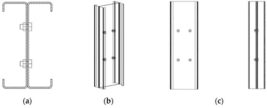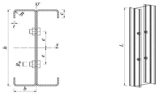 Steel structures and composite structures have been widely used in civil and industrial engineering [,,]. Due to its advantages of light weight, high strength, energy saving, environmental protection, and rapid construction [,], the cold-formed thin-walled steel structure has been widely used in engineering structures [,,,]. In applications of the columns, two or more U-shaped and C-shaped cold-formed thin-walled steel members are usually connected with self-tapping screws, rivets, or bolts to form combined columns with better mechanical properties. The combined components are suitable for multistorey buildings [,,,]. Compared with a single section, a cold-formed thin-walled steel combined column has the advantages of greatly improving the bearing capacity, bending and torsional stiffness, and convenient manufacturing and construction [,]. Among all kinds of combined cross-sections, the I-shaped cross-section with two C-shaped cross-sections assembled back-to-back is the most widely used, and its structural schematic diagram is shown in Figure 1. In this paper, this type of combined column is called a C-steel combined I-section column.