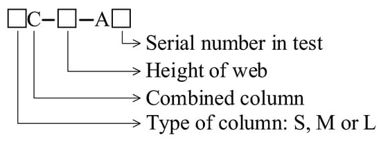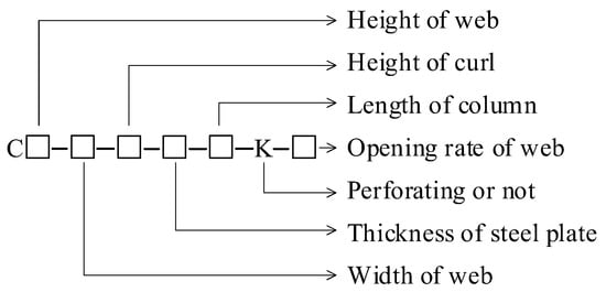 To investigate the effects of different parameters on the ultimate compressive bearing capacity of the combined columns, 171 combined columns were analyzed in this section. In the analyses, the initial defect mode was set as the first-order buckling mode shape, and the defect value was set as L/1000 [], where L is the length of the column. In this section, the effects of the holes on the web were also studied, and the naming rule of the combined columns in the parametric analyses is shown in Figure 7.
