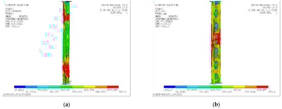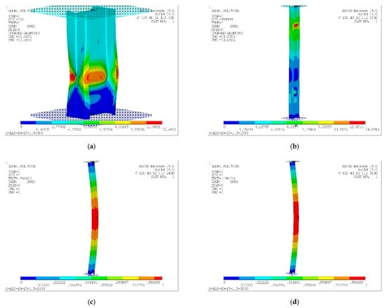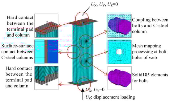 According to the material tests in [], the elastic modulus, Poisson’s ratio and yield strength of the steel were set as 2.05 × 105 N/mm2, 0.303 and 305.4 N/mm2, respectively. In the finite element simulations, the von Mises yield rule was used. To simulate the boundary conditions, in the finite element models, the translation displacements ux, uy, and uz of the upper terminal pad were constrain, and the ux and uy displacements of the bottom terminal pad were fixed. The finite element model of the C-steel combined I-section column is shown in Figure 4.