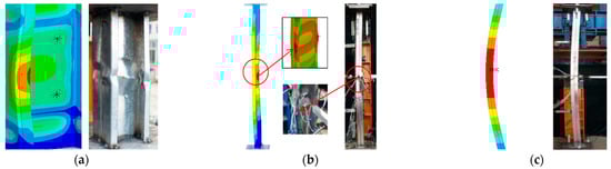 The ultimate compressive bearing capacities of the combined columns in experiments and simulations are listed in Table 2. In Table 2, NFE and NTE denote the compressive bearing capacities obtained by the finite element analyses and experiments. According to Table 2, the compressive bearing capacities obtained by the simulations and experiments were similar, and the average error was 2.6%. Furthermore, the failure mode obtained by the simulations were the same as those observed in the tests. Figure 5 shows the load–vertical displacement (F-Δ) relationship curves of the specimens. For the short, medium, and long combined columns, the curves obtained by tests and simulations were similar. Moreover, the failure modes of the C-steel combined I-section columns are compared in Figure 6. The failure modes observed in the tests and predicted in the numerical analyses were the same. Therefore, the finite element modeling method was validated and can be adopted to investigate the ultimate compressive bearing capacity of the C-steel combined I-section columns.