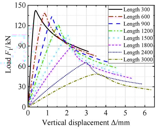 To investigate the effects of the slenderness ratio on the ultimate compressive bearing capacity, the combined columns, C90-40-15-1.5, C120-40-15-1.5, C140-40-15-1.5, and C160-40-15-1.5, with different lengths (300, 600, 900, 1200, 1500, 1800, and 3000 mm) were modeled in this section. Taking C120-40-1.5 combined columns as examples, with different length, the failure modes of the columns are shown in Figure 8, and the load–vertical displacement relationship curves of C120-40-1.5 combined columns are shown in Figure 9. For the short, medium, and long columns, the failure modes were local, local buckling–distortion, and overall buckling, respectively.