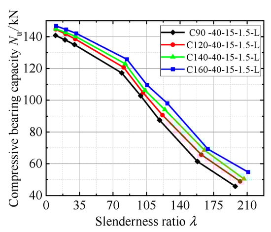 With different slenderness ratios, the ultimate compressive bearing capacities of the four series combined columns are shown in Figure 10. The compressive bearing capacity decreased with the increase in the slenderness ratio. When the slenderness ratios ranged from 10 to 75 and 150 to 210, the compressive bearing capacity decreased slowly. With the slenderness ratios lower than 75, the two C steels in the combined columns constrained with each other, and only local buckling could be observed. When the slenderness ratios were 75~150, the compressive bearing capacity decreased rapidly, caused by the distortion in the combined columns. When the slenderness ratios were greater than 150, overall buckling occurred. Thus, the compressive bearing capacity decreased rapidly.
