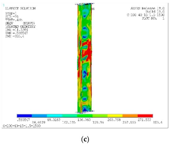 Stress distortions of the combined columns with different height to thickness ratios of web (a) C90-40-15-1.5-1500; (b) C160-40-15-1.5-1500; (c) C200-40-15-1.5-1500.