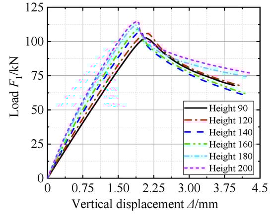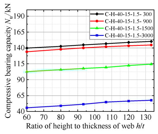 To investigate the effects of height to thickness ratio of the web on the ultimate compressive bearing capacity of the C-steel combined I-section columns, parametric analyses were carried out on the columns with a width of flange, height of the curling, and thickness of the steel of 40 mm, 15 mm, and 1.5 mm, respectively. Furthermore, the columns with length of 300 mm, 900 mm, 1500 mm, and 3000 mm were analyzed. By changing the height of the C steels, the stress distributions of the 1500 mm-length combined columns are shown in Figure 11. With different height of the web, the load–vertical displacement relationship curves are shown in Figure 12. According to Figure 11 and Figure 12, with the increase in the height to thickness ratio, the vertical displacement decreased, and the ultimate bearing capacity increased. The maximum stresses gradually shifted to the web of the component. The ultimate compressive bearing capacity versus height to thickness ratio of the web relationship curves are shown in Figure 13. With the increase in height to thickness ratio of the web, the bearing capacity increased slowly. For the four series of combined columns, the increasing ratio of the height to thickness ratio was 122.2%, and the increasing ratios of the compressive bearing capacity were 7.5%, 8.0%, 11.5%, and 25.8%, respectively. In the models of the combined columns, with the increase in the height to thickness ratio of the web, the cross-sectional areas of the columns increased. Additionally, it further reduced the effect of height to thickness ratio of the web. Moreover, the direction of the web was in the major axis of the combined columns, and the failure of the columns was mainly in the weak axis. Thus, the effects of the height to thickness ratio of the web was not so obvious.
