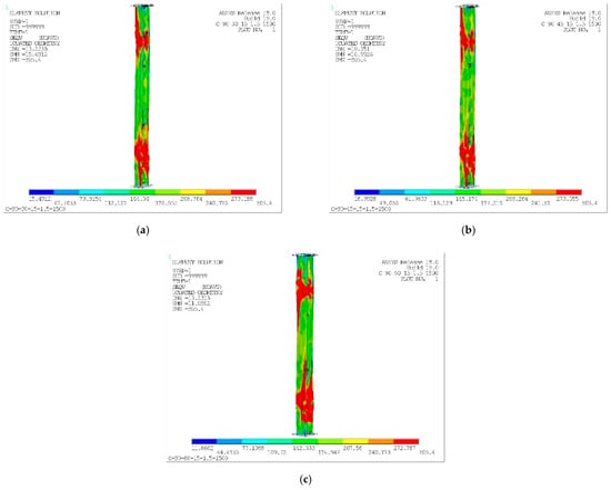 Stress distortions of the combined columns with different width to thickness ratios of flange (a) C90-30-15-1.5-1500; (b) C90-45-15-1.5-1500; (c) C90-60-15-1.5-1500.