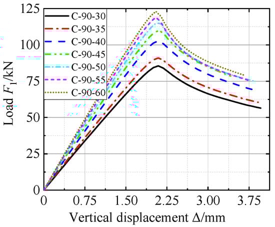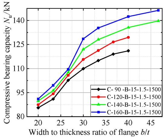 In the parametric analyses, the thickness of the thin-walled steel plate was set as 1.5 mm, and the height of the curling and the length of the column were 15 mm and 1500 mm, respectively. The combined columns with a height of 90 mm, 120 mm, 140 mm, and 160 mm were analyzed in this section. For the C90 series combined columns, under the ultimate compressive load, the stress distributions are shown in Figure 14. With the increase in the width to thickness ratio of the flange, the maximum stress gradually distributed on the flanges, which means that the loads bore by the flanges increased. Figure 15 shows the load–vertical displacement relationship curves of C90 series combined columns. The large width to thickness ratio of the flanges constrained the deformation. The ultimate compressive bearing capacity versus width to thickness ratio of the flange are shown in Figure 16. With the increase in the width to thickness ratio, the ultimate compressive bearing capacity increased. Furthermore, when the width to thickness of the flange was in the range of 22.5 to 30, the compressive bearing capacity increased rapidly. The direction of the flange was along the weak axis of the C-steel combined I-section column. Therefore, the effects of the width to thickness ratio of the flange were more obvious than those of the height to thickness ratio of the web. In this section, the parametric analyses were carried out on the medium columns. The large flange constrained the distortion of the columns effectively. It was the reason why the ultimate compressive bearing capacity increased with the increasing width to thickness ratio of the flange.
