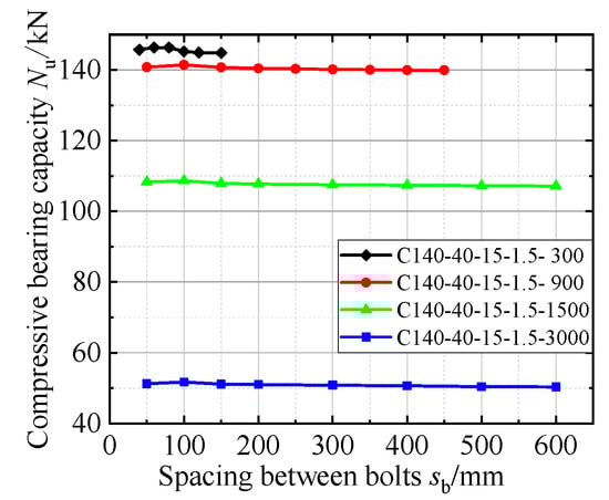 The two C-steels were combined by the bolts on the webs to form an I-section column. The bolt spacing affects the combined effects. Li et al. recommended that the bolt spacing of the combined column should not be greater than 600 mm, and the number of bolts should be greater than three (when the length of the column is greater than 600 mm) []. In this section, parametric analyses were carried out on C140-40-15-1.5 combined columns to investigate the effects of the bolt spacing on the ultimate compressive bearing capacity. The lengths of the columns were set as 300 mm, 900 mm, 1500 mm, and 3000 mm. In the parametric analyses, the bolt spacings of the columns with different length can be found in Table 3. With different bolt spacing, the ultimate compressive bearing capacity of the I-section combined columns are shown in Figure 17. According to Figure 17, the bolt spacing had less influence on the compressive bearing capacity. For the four series of combined columns with different length, the bolt spacing increasing ratios were 275%, 800%, 1100%, and 1100%, respectively. However, the ultimate bearing capacity only increased by 0.6%, 0.6%, 1.1%, and 1.8%, respectively.