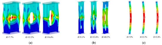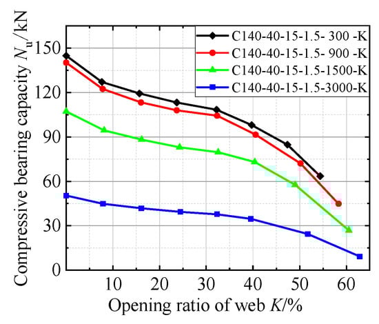 With different lengths and opening ratios, the failure modes of the C-steel combined I-section columns are shown in Figure 18. With the increase in the opening ratio, the deformation of the columns was greater, and the local failure was more obvious in the middle of the combined columns. The relationship between the ultimate compressive bearing capacity and the opening ratios are shown in Figure 19. With the increase in the opening ratio, the compressive bearing capacity decreased. The decreasing ratios of the columns with 0~15% and 35~60% opening ratios were much greater than the columns with opening ratios of 15~35%. For the four series of combined columns with different length, the maximum increasing ratios of the opening ratio were 54.4%, 58.3%, 60.5%, and 62.9%, respectively, and the corresponding ultimate compressive bearing capacity decreased by 56.1%, 68.0%, 74.9%, and 81.7%, respectively. Except in the case that the openings reduced the sectional area of the web, the opening affected the half-wave length of the short column when the distortion happened, which reduced the compressive bearing capacity. For the medium and long combined columns, the openings aggravated the buckling of members and reduced the bearing capacity of the combined columns.