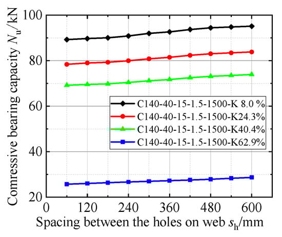 In the last section, it was found that the location of the opening in the web affected the half-wave length of the columns. Therefore, in this section, parametric analyses were conducted to investigate whether the opening spacing has an influence on the ultimate compressive bearing capacity. Four series of C140-40-15-1.5 combined columns, with a length of 1500 mm, were modeled, and the opening ratios were set as 8.0%, 24.3%, 40.4%, and 62.9%, respectively. The opening spacings were in the range of 60~600 mm, with an increasing step of 60 mm. The relationship between the ultimate compressive bearing capacity and opening ratios are shown in Figure 20. According to Figure 20, the compressive bearing capacity increased with the increasing opening spacing, but the effects of the opening were not so obvious. When the opening spacing increased by 900%, the ultimate compressive bearing capacities of the four groups of combined columns increased by 6.5%, 6.9%, 6.8%, and 11.7%, respectively.