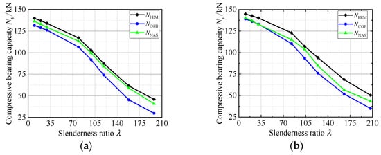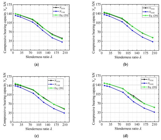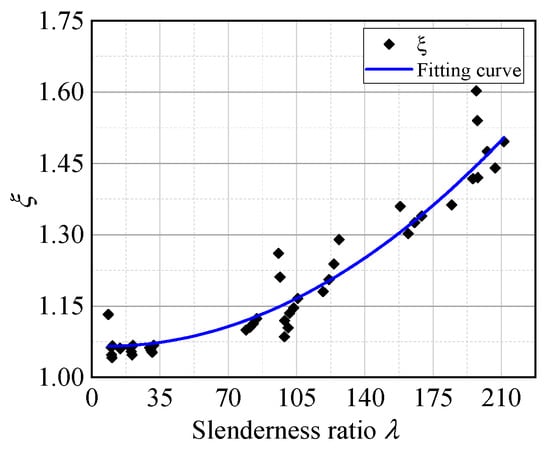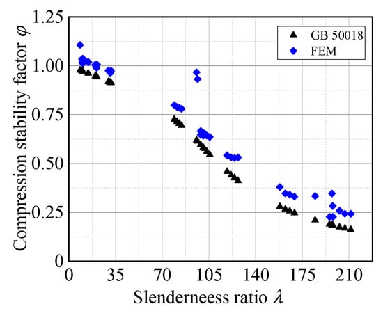 In Equations (10) and (11), λc is the influence coefficient of flexibility with overall buckling, and . Ag denotes the area of the cross section, and fcre is the elastic buckling stress.