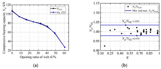 In Equations (12) and (13), λ1 is the influence coefficient of flexibility with local buckling, and . fne and fol are the critical elastic buckling stress with overall and local buckling, respectively, and .