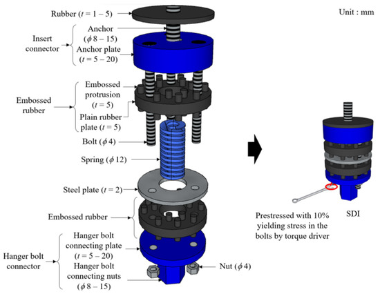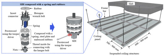 Figure 1 shows the details of the SDI for enhancing the seismic resistance of the suspended ceiling structures. The SDI is composed of an insert connector, a spring, a steel plate, embossed rubbers, prestressed bolts, nuts, and a hanger bolt connector. The insert connector was composed of a screw bolt and a plate for connecting the SDI and slab. The embossed rubbers and steel plate were laminated and combined using three screw bolts and nuts, and a spring was inserted in the center. Three screw bolts were prestressed using the torque driver, which had a thread inside to connect to the hanger bolts. Compositions using prestressed bolts are effective in enhancing the damping performance of rubbers and spring [10,11]. Therefore, the SDI is expected to control seismic waves and vibrations from the higher damping performance, resulting in higher energy dissipation and lower demanding shear resistance of suspended ceiling structures.