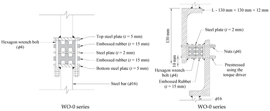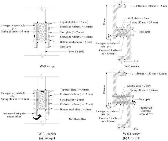 Figure 2 shows the details of the SDI specimens based on the main parameters. The specimens were divided into two groups: groups I and II for the specimens subjected to axial and shear loadings (Table 1), respectively. In each group, the main parameters were the presence or absence of a spring, loading type, and magnitude of the prestressed force introduced to the bolts to connect the embossed rubbers. The prestressed force magnitude varied from 0 to 10% of the yielding strength of the bolt (), and the loading type was monotonic or cyclic. The specimens were named according to their main parameters. The first letter indicates the presence or absence of a spring (W = SDI with a spring and WO = SDI without a spring), the second number indicates the magnitude of the prestressed force introduced to the bolts (0 = 0 and 0.1 = 0.1), and the last letter indicates the loading type (M = monotonic loading and C = cyclic loading).