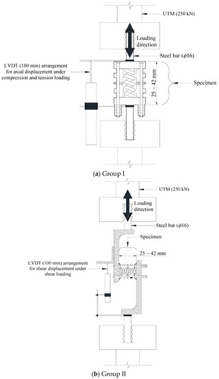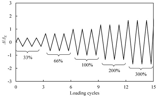 Figure 3 shows the test set-up for the specimens subjected to axial or shear loading. Axial and shear loads were applied using a universal testing machine a capacity of 250 kN. In group I, monotonic and cyclic axial loads were applied by compressive force up to the design displacement of the spring, and then subjected to tensile force until the specimen failed. In the compression direction, the design displacement of the spring was determined from the spring constant and free field [10]. In Groups I and II, the history of cyclic loading for the specimens subjected to axial and shear loads is shown in Figure 4. During cyclic loading, the incremental displacement at each loading cycle was determined from the elastic limit obtained from the load–displacement of the specimens subjected to monotonic axial or shear loads. The elastic limit point was assumed as 40% of the maximum load in accordance with the allowable stress design [14]. The axial and shear displacements were increased by 33, 67, 100, 200, and 300% of the displacement at the elastic limit point (), and three cycles were iterated at each displacement increment. The axial and shear displacements were measured using a 100 mm capacity linear variable differential transducer (LVDT).