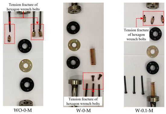 However, the values predicted by Equations (10)–(12) were higher in the specimens subjected to monotonic loads than in the specimens subjected to cyclic loads, indicating that and were 0.81 and 0.04, respectively. Consequently, Equations (10)–(12) should be underestimated by 81.7% when estimating the shear load of the SDI specimens subjected to a cyclic load. Metallic materials subjected to fatigue loads show lower shear or tensile capacity than static loads because they are affected by microcracks that occur in the internal structure and external surfaces [25]. Therefore, the bolts and springs constituting the SDI unit under repeated load could suffer more damage than the static load at the same displacement, resulting in a lower capacity than the yielding strength.