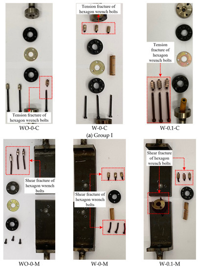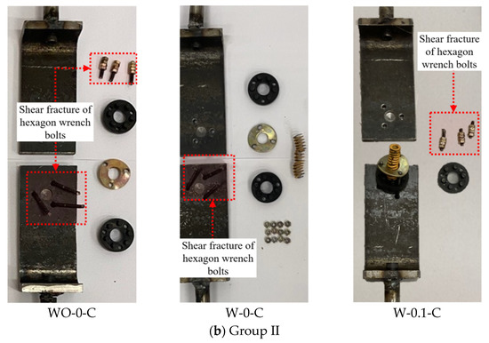 Figure 5 shows the failure modes of the SDI specimens subjected to axial and shear loading. In Group I, the specimens subjected to axial loading were governed by tension, and the tension fracture of the hexagonal wrench bolts was observed. The effects of the presence or absence of a spring, prestressed force magnitude, and loading type on this trend were insignificant. The failure mode of the specimens in Group II was similar to that of the specimens in Group I, indicating shear fracture of the hexagonal wrench bolts. The effect of the presence or absence of a spring, prestressed force magnitude, and loading type on the trend observed in Group II was also insignificant. Meanwhile, significant shear deformation was observed in the spring of the SDI specimens subjected to shear loads. However, the axial deformation of the spring was insignificant in SDI specimens subjected to an axial load. This implies that the contribution of the axial or shear resistance was mostly from hexagonal wrench bolts.