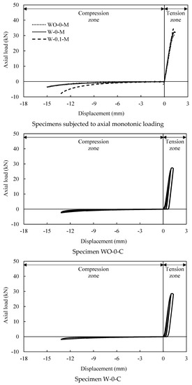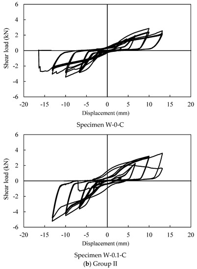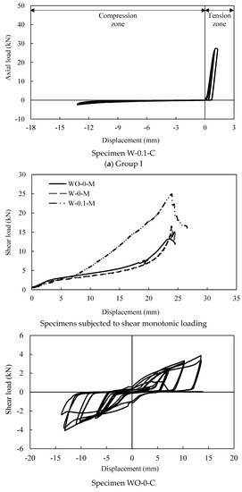 Figure 6 shows the load–displacement relationship of the specimens subjected to axial or shear loads. The stiffness up to the elastic limit point () was significantly affected by the loading type rather than by the presence or absence of a spring or the magnitude of the prestressed force. The of the specimens with a spring was 1.26 times higher than that of the specimens without a spring. In addition, when the prestressed force magnitude increased from 0 to 0.1, increased by 1.15 times. In particular, this increasing rate was approximately 1.01 times higher for the specimens under monotonic loading than those under cyclic loading. After , the stiffness gradually decreased with an increase in axial displacement. After the peak load, the stiffness was affected by the loading type, prestressed force magnitude, and the presence or absence of a spring. The post-peak behavior tended to be more ductile for specimens with a spring and a higher prestressed force magnitude. This trend was more pronounced in the specimens subjected to the monotonic load than the cyclic load. Meanwhile, the effect of the presence or absence of a spring, prestressed force magnitude, and loading type on the trend observed in Group II (specimens subjected to shear loads) was similar to that of the specimens in Group I (specimens subjected to axial loads). Consequently, in the post-peak behavior, the highest ductility was observed in the W-0.1-M series (with a spring and prestressed force magnitude of 0.1) that was subjected to monotonic loads. This implies that the presence or absence of a spring, prestressed force magnitude, and loading type significantly affect the ductility of the SDI specimens.
