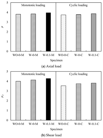 where and are the ductility ratios subjected to axial and shear loads, respectively, Δ80 is the displacement at 80% of the ultimate state after the peak load, and is the displacement at the yielding state. Equation (1) is defined as the , which includes the strain in the descending branch of the load-axial strain relationship. Equation (2) is defined as , which can include the deformation of post-peak behavior. These ductility indices are commonly used by researchers to investigate the ductility of structural members, such as columns, shear walls, and beams [17,18,19,20,21]. Note that and were evaluated on the SDI specimens subjected to only axial tensile and shear loads, respectively. In Equations (1) and (2), the value was assumed to be because it is difficult to measure. As summarized in Table 3 and Table 4, and Figure 7, μ and were significantly affected by the magnitude of the prestressed force and loading type, rather than the presence or absence of a spring. The axial and shear displacement ductility ratios increased by 1.03 and 1.03 times, when the prestressed force magnitude increased from 0 to 0.1. The corresponding values of the SDI specimens subjected to cyclic loading were approximately 2.1% and 10.6% lower than those subjected to monotonic loading. It was confirmed that the loading type is an important design factor for the ductility of the SDI specimens.