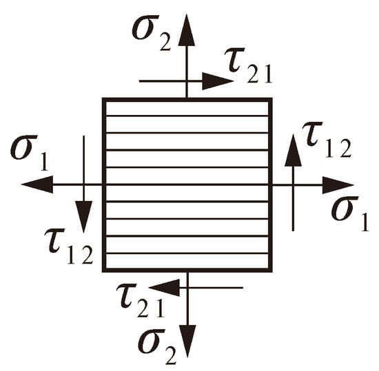 Each single-layer of the laminate is usually assumed to be in the plane-stress state. As shown in Figure 2, σ1 and σ2 are the normal stress components in the principle directions of the single-layer, and τ12 represents the shear stress component. The constitutive equations relating in-plane stresses and strains for each layer are expressed in the material coordinate system as