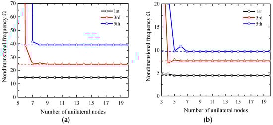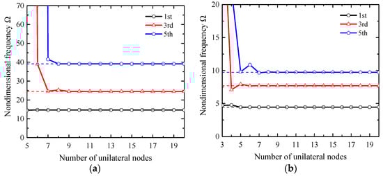 For square laminates (h/b = 0.001 and 0.2) with CCCC and SSSS boundary combinations, the variations of nondimensional natural frequencies versus the number of unilateral Gauss–Lobatto nodes are depicted in Figure 5 and Figure 6, in which the fiducial lines indicate the convergence values of frequency parameters. Note that in the present paper, if the result with three decimal digits reaches a constant value, the calculation is seen as converged. One can find from Figure 5 and Figure 6 that for both CCCC and SSSS plates, the minimum number of unilateral nodes required to make the nondimensional frequencies converge is 11 when h/b = 0.001 and 0.2.