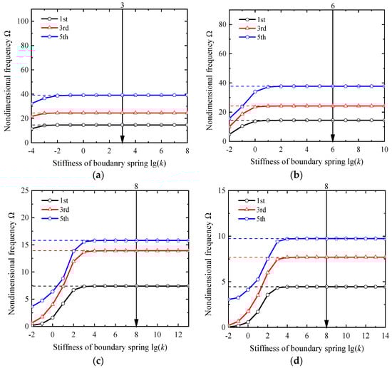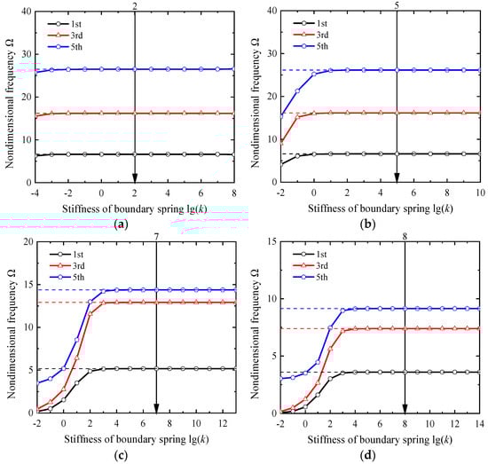 Table 2 lists the optimal values of the boundary spring stiffnesses for clamped and simply supported boundaries. It should be emphasized that the lower limit of k is rigorously determined by the point where the first five frequency parameters accurate to four decimal places converge. This may not be shown clearly shown in Figure 7 and Figure 8 due to the slight variation in the nondimensional frequency during the stationary part of the curve.