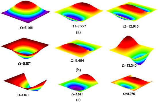 The first three modes for square laminates (0°, 90°, 0°) with h/b = 0.1: (a) SSSS; (b) SCSC; (c) SSSF.