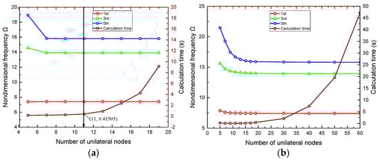 Variations of nondimensional frequencies and the corresponding calculation time vs. the number of unilateral nodes for CCCC laminates with h/b = 0.1: (a) the present method; (b) FEM using Q4 element.