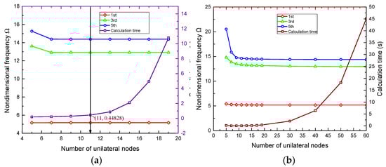 Varying the number of unilateral nodes, the first six nondimensional frequencies are calculated by the present method and the FEM adopting the commonly used Q4 element. It should be pointed out that all the calculations are made by running the same software program on the same computer to guarantee the effectiveness of comparisons. The variations of both the runtime and frequencies in terms of node number per edge are presented in Figure 10 and Figure 11. Note that for clarity, only the variations of the first, third and fifth frequencies are depicted in these figures. One can see that for both CCCC and SSSS cases, when using the present method, only 11 Gauss–Lobatto nodes per edge are needed to make the first six frequency parameters with three decimal digits converge, and the calculation time is less than 0.5 s. In contrast, when using FEM, the first six modes do not converge even when the number of nodes per edge reaches 60, and the calculation time already exceeds 45 s. These results demonstrates that the present method has incomparable advantages in computation efficiency over the classical FEM, and the remarkable convergence of the current solution is also demonstrated.